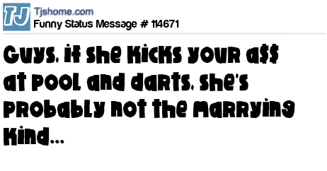 X is Guys, if she kicks your a$$ at pool and darts, she's probably not the marrying kind...