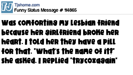 X is Was comforting my lesbian friend because her girlfriend broke her heart. I told her they have a pill for that. "What's the name of it?" she asked. I replied "trycoxagain"