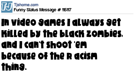 X says In video games I always get killed by the black zombies, and I can't shoot 'em because of the r acism thing.