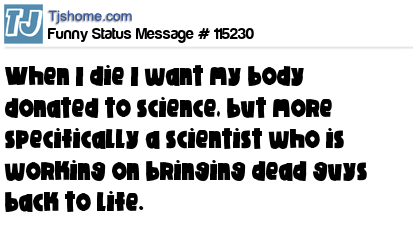 - # 121136 Just donated my body to science. I'm your problem now, science and I could use some hot wings and beer.