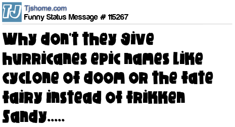 - # 115458 Who names these hurricanes? I don't want to die in a hurricane named sandy, I wanna be wiped out by the cyclone of doom, the hurricane of pain or even the population ripper but please god, not sandy!