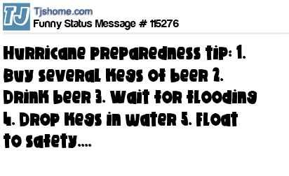 X Hurricane preparedness tip: 1. Buy several kegs of beer 2. Drink beer 3. Wait for flooding 4. Drop kegs in water 5. Float to safety....