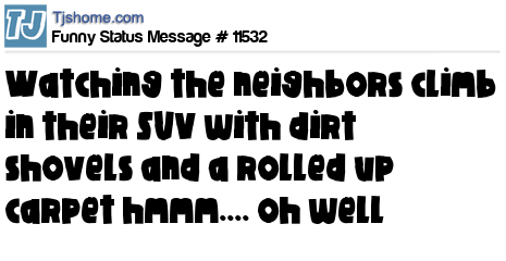 X is Watching the neighbors climb in their SUV with dirt shovels and a rolled up carpet hmmm.... oh well