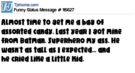 X Almost time to get me a bag of assorted candy. Last year I got mine from Batman. Superhero my ass. He wasn't as tall as I expected... and he cried like a little kid.
