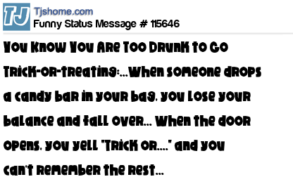 X You Know You Are Too Drunk to Go Trick-or-treating:...When someone drops a candy bar in your bag, you lose your balance and fall over... When the door opens, you yell "Trick or...." and you can't remember the rest...
