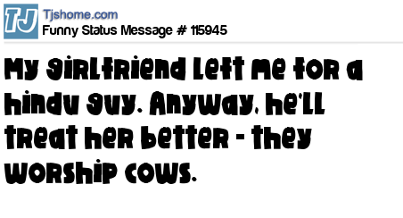 X says My girlfriend left me for a hindu guy. Anyway, he'll treat her better - they worship cows.