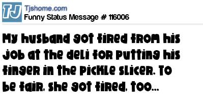 X My husband got fired from his job at the deli for putting his finger in the pickle slicer. To be fair, she got fired, too...