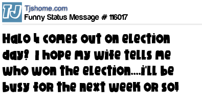 X is Halo 4 comes out on election day? I hope my wife tells me who won the election....i'll be busy for the next week or so!