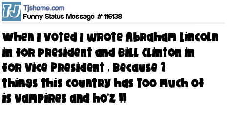 X is When I voted I wrote Abraham Lincoln in for president and Bill Clinton in for Vice President , Because 2 things this country has Too much of is vampires and ho'z !!