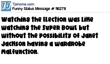 X Watching the Election was like watching the Super Bowl but without the possibility of Janet Jackson having a wardrobe malfunction.