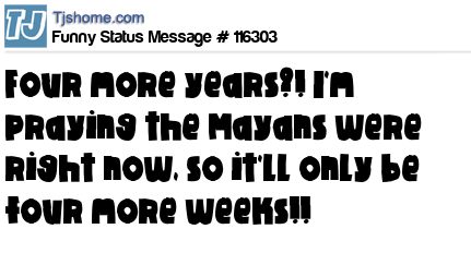 X says Four more years?! I'm praying the Mayans were right now, so it'll only be four more weeks!!
