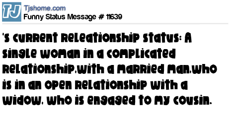 X 's current releationship status: A single woman in a complicated relationship,with a married man,who is in an open relationship with a widow, who is engaged to my cousin.