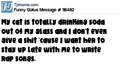 X says My cat is totally drinking soda out of my glass and I don't even give a shit 'cause I want her to stay up late with me to write rap songs.