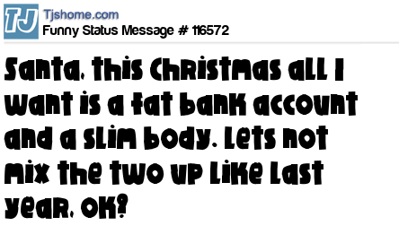 X Santa, this Christmas all I want is a fat bank account and a slim body. Lets not mix the two up like last year, ok?