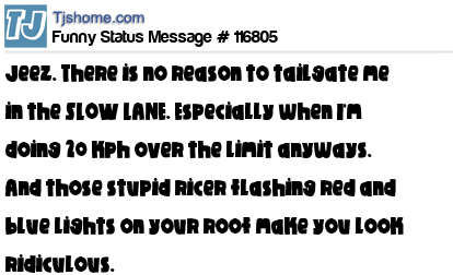 - # 209443 There's no reason to tailgate me when I'm already doing 70 in a 35 zone. And those flashing lights on top of your car look ridiculous.