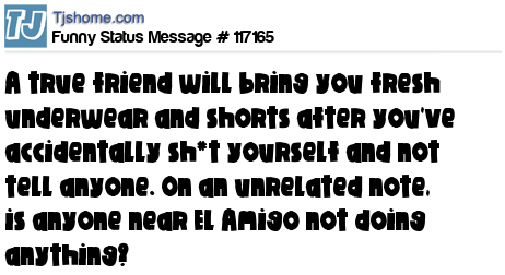 X A true friend will bring you fresh underwear and shorts after you've accidentally sh*t yourself and not tell anyone. On an unrelated note, is anyone near El Amigo not doing anything?