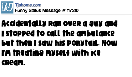 X says Accidentally ran over a guy and I stopped to call the ambulance but then I saw his ponytail. Now I'm treating myself with ice cream.