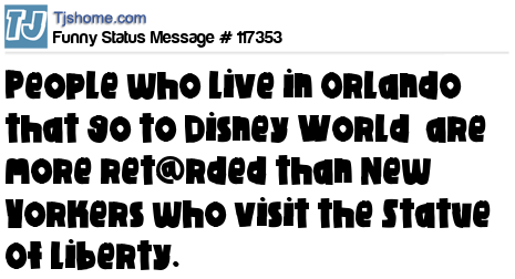 X People who live in Orlando that go to Disney World are more ret@rded than New Yorkers who visit the Statue Of Liberty.