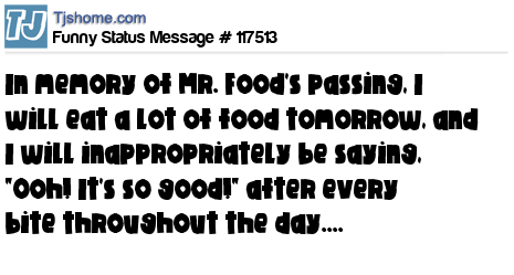 X says In memory of Mr. Food's passing, I will eat a lot of food tomorrow, and I will inappropriately be saying, "Ooh! It's so good!" after every bite throughout the day....