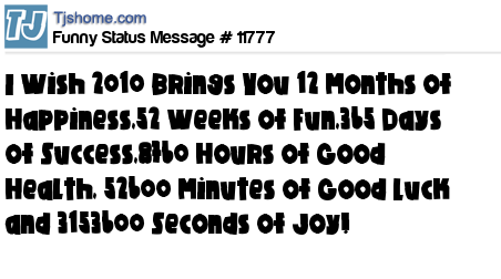 - # 11779 I hope 2010 Brings You 12 Months of Happiness, 52 Weeks of Fun, 365 Days of Success, 8,760 Hours of Good Health, 525,600 Minutes of Gods Favor, and 31,536,000 Seconds of Joy!