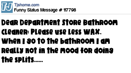 X Dear Department Store Bathroom Cleaner: Please use less WAX. When I go to the bathroom I am really not in the mood for doing the splits......