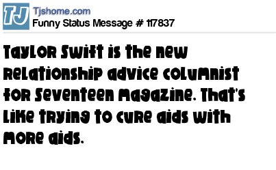 X says Taylor Swift is the new relationship advice columnist for Seventeen magazine. That's like trying to cure aids with more aids.