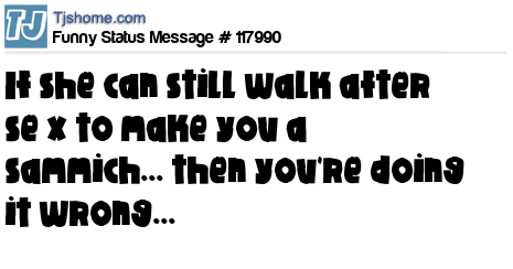 - # 109482 Guys are always saying they get their woman to make them a sandwich right after sex. If she can walk straight after having sex, you're doing it wrong! Go make your own damn sandwich!