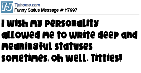 X says I wish my personality allowed me to write deep and meaningful statuses sometimes, oh well. Titties!