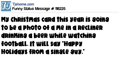 X says My Christmas card this year is going to be a photo of a me in a recliner drinking a beer while watching football. It will say "Happy Holidays from a single guy."