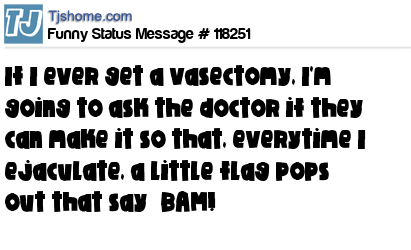 X If I ever get a vasectomy, I'm going to ask the doctor if they can make it so that, everytime I ejaculate, a little flag pops out that say “BAM!”