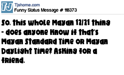 X So, this whole Mayan 12/21 thing - does anyone know if that's Mayan Standard Time or Mayan Daylight Time? Asking for a friend.