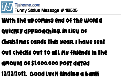 X with the upcoming end of the world quickly approaching, in lieu of Christmas cards this year, I have sent out checks out to all my friends in the amount of $1,000,000 post dated 12/22/2012. Good luck finding a bank that isn't under water everyone!