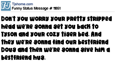 X Don't you worry your pretty stripped head we're gonna get you back to Tyson and your cozy tiger bed. And they we're gonna find our bestfriend Doug and then we're gonna give him a bestfriend hug.