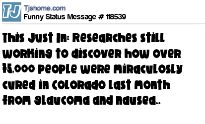 X This Just In: Researches still working to discover how over 75,000 people were miraculosly cured in Colorado last month from glaucoma and nausea..