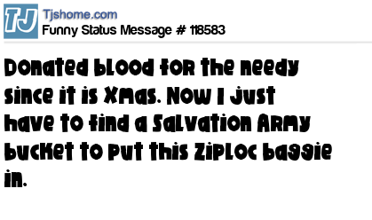 X Donated blood for the needy since it is Xmas. Now I just have to find a Salvation Army bucket to put this Ziploc baggie in.