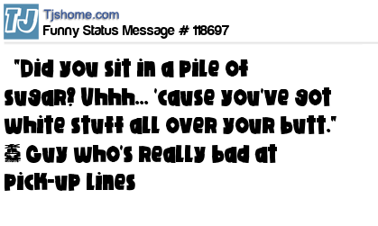 X  "Did you sit in a pile of sugar? Uhhh... 'cause you've got white stuff all over your butt." ~ Guy who's really bad at pick-up lines ツ