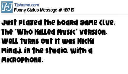 X Just played the board game Clue, The "Who killed music" version. Well turns out it was Nicki Minaj, in the studio, with a microphone.