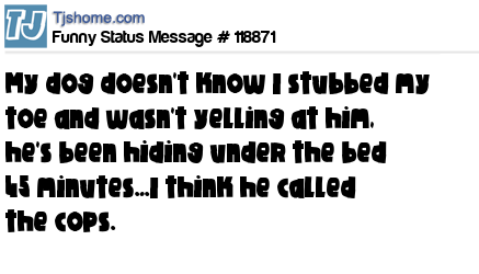X says My dog doesn't know I stubbed my toe and wasn't yelling at him, he's been hiding under the bed 45 minutes…I think he called the cops.