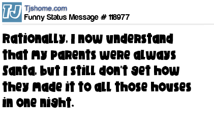 - # 120063 I've long accepted the fact my parents were Santa. But what I still don't get is how they manage to deliver all the presents around the world in a single night