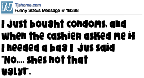 - # 119105 I just bought a pack of Condoms and the cashier asked me, "Sir do you need a bag"; I replied, "Na! She ain't that ugly". :)