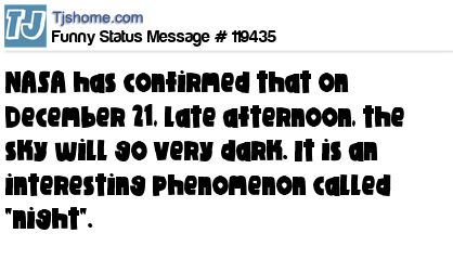 - # 119325 NASA has confirmed that December 21, late afternoon, the sky will be very dark. It is an interesting phenomenon called "night".