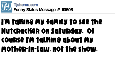 - # 83262 My wife is taking my kids to go see the nut cracker this weekend. Of course I'm talking about my mother in law not the show.