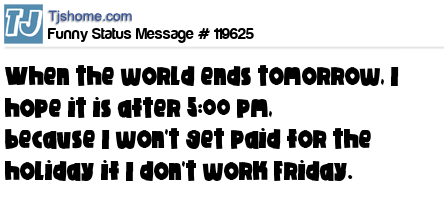 X When the world ends tomorrow, I hope it is after 5:00 pm, because I won't get paid for the holiday if I don't work Friday.