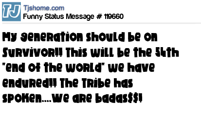 X is My generation should be on Survivor!! This will be the 54th "end of the world" we have endured!! The Tribe has spoken....We are badas$$!