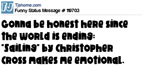 X Gonna be honest here since the world is ending: "Sailing" by Christopher Cross makes me emotional.