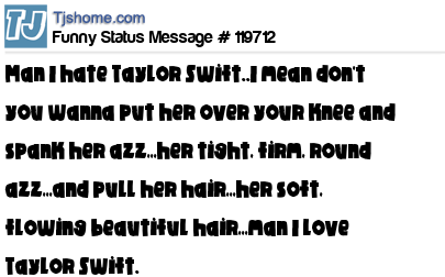 X Man I hate Taylor Swift..I mean don't you wanna put her over your knee and spank her azz,,,her tight, firm, round azz,,,and pull her hair,,,her soft, flowing beautiful hair,,,man I love Taylor Swift.
