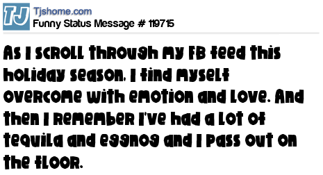 X As I scroll through my FB feed this holiday season, I find myself overcome with emotion and love. And then I remember I've had a lot of tequila and eggnog and I pass out on the floor.