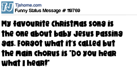 X My favourite Christmas song is the one about baby Jesus passing gas. Forgot what it's called but the main chorus is "Do you hear what I hear?"