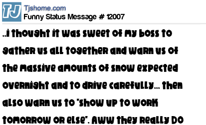 X ..i thought it was sweet of my boss to gather us all together and warn us of the massive amounts of snow expected overnight and to drive carefully... then also warn us to "show up to work tomorrow or else". Aww they really DO care!