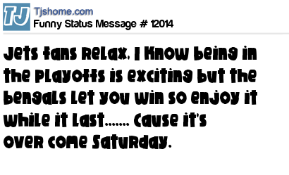 X Jets fans relax, I know being in the playoffs is exciting but the bengals let you win so enjoy it while it last....... Cause it's over come Saturday.